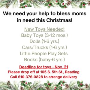 We invite our moms who have participated in parenting education, mom’s group, or a Bible study to come to the center to choose Christmas gifts for their child and have those gifts wrapped. We also bless them with a personal gift and homemade Christmas cookies to take home. If you would like to help bless our moms, please drop off new, unwrapped toys by Nov. 21.