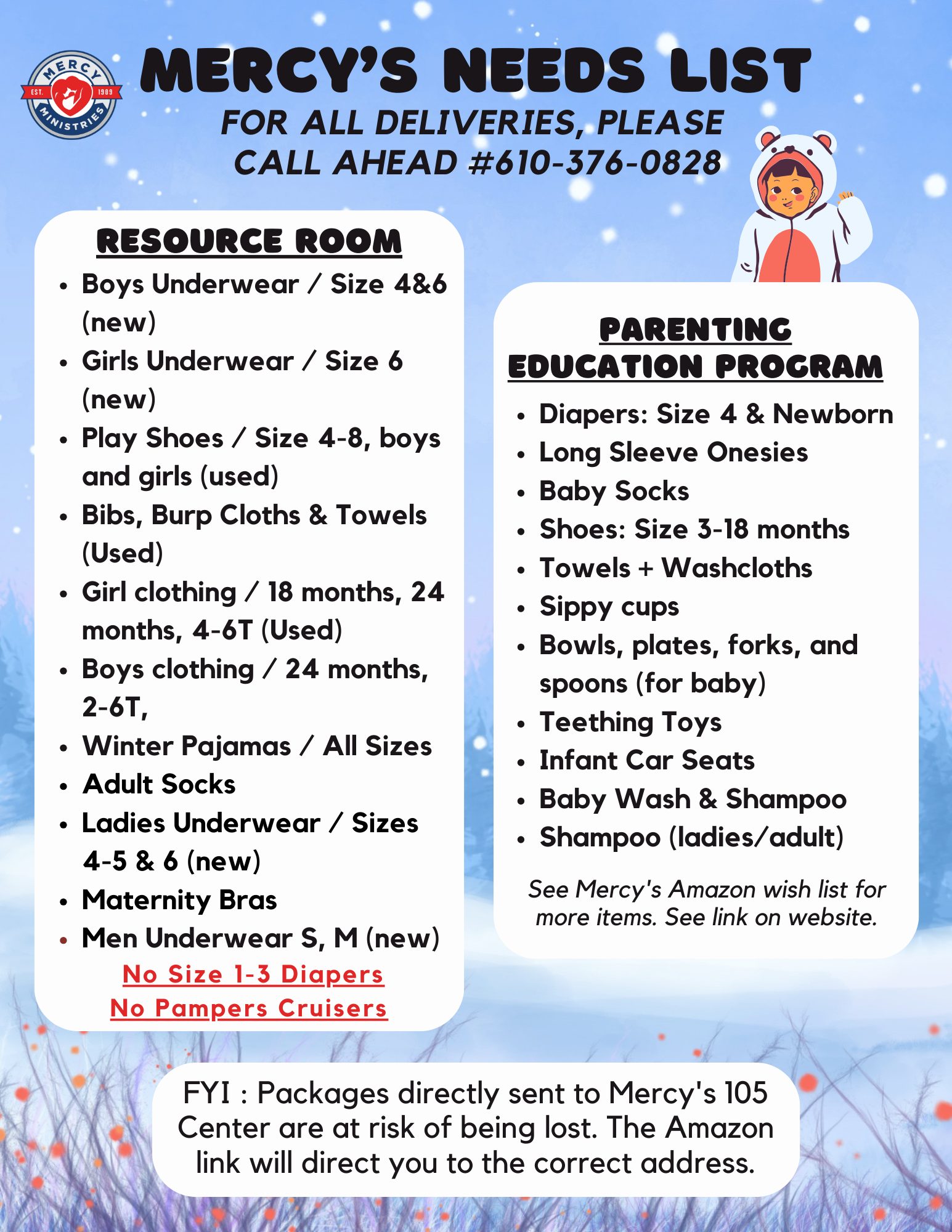 From the comfort of your home, you can directly ship diapers and other needed items listed below. Order items from an online merchant and directly ship them to our liaison.